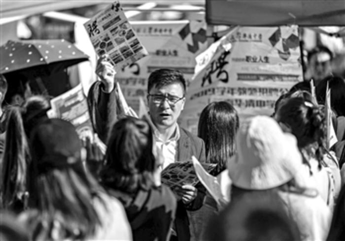 10月11日,招聘人员在招聘会上分发材料。当日,全国第七届大中城市联合招聘高校毕业生秋季巡回招聘会“昆明站”活动在云南民族大学雨花校区举行,来自安徽、吉林、广东、河北、贵州、上海的39家企业以及云南省内的230余家用人单位参加招聘会,为高校毕业生提供4000余个岗位。新华社记者 江文耀 摄