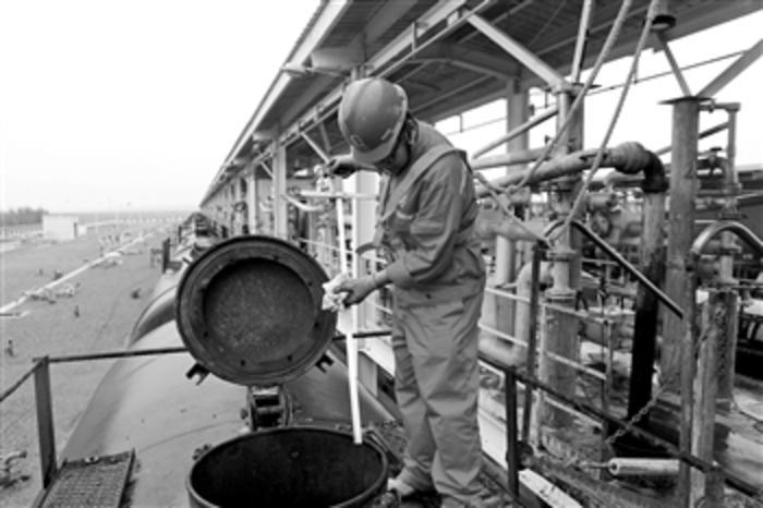 中国石化西北油田油气运销部在油气产品销售计量中,严把计量交接关,不断提升计量器具精准度和技术管理水平。图为计量人员严格按照操作规范,对火车原油罐车进行检尺计量。 张守卫 王磊 摄