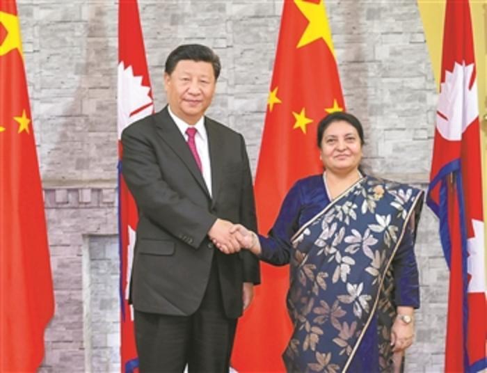 习近平指出,今年4月在北京,你盛情邀请我年内访问尼泊尔。我今天如约而来。正如总统女士所说,中尼之间只有友好和合作。在机场和沿途欢迎人群的脸上,我看到了尼泊尔人民真诚的笑容,感受到了他们对中国人民发自内心的友好,让我再次感受到中尼友好在尼泊尔拥有广泛共识和扎实根基。中尼两国人民心意相通、休戚与共,是邻国友好交往的典范。我希望通过这次访问,传承中尼传统友谊,顺应两国人民期待,推动两国关系更上一层楼。
