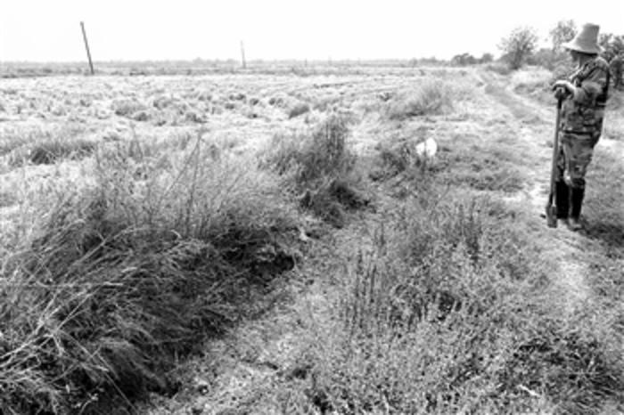 江西省南昌市南昌县蒋巷镇一农户在田里查看中稻的收割情况和晚稻的生长情况,农田两侧的水渠已干涸多日(10月10日摄)。