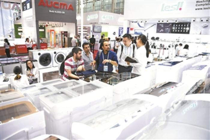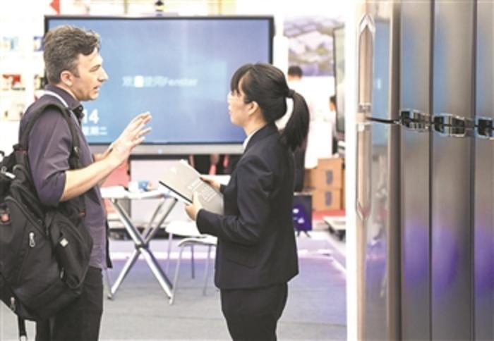 10月15日,参展商与采购商在家用电器展台洽谈。