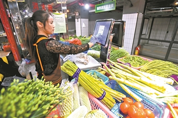 10月15日,今朝星市集智慧农贸市场的蔬菜经营户在操作电子结算系统。