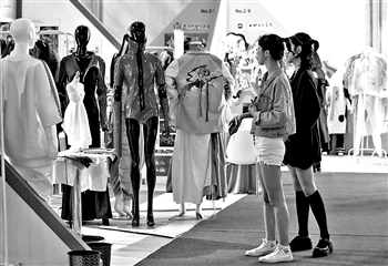 图为2019中国国际大学生时装周上,观众在参观新锐设计师品牌服装。 本报记者 刘金梦 摄