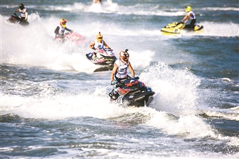 经过四天的激烈争夺,青岛蓝谷UIM—海尔世界水上摩托锦标赛于10月13日在即墨区蓝谷滨海公园圆满收官。图为参赛选手在比赛中激烈角逐。(亚男 摄)