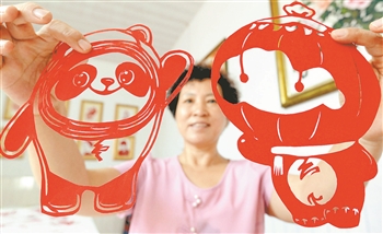 图为冯石萍展示她创作的剪纸作品——北京2022年冬奥会和冬残奥会吉祥物“冰墩墩”和“雪容融”。郝群英 摄/视觉中国
