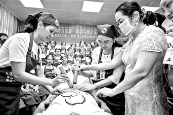10月14日, 在海南省工会职工培训中心举办的”精准培训、助力扶贫”高级母婴护理(产康)技能培训班上,来自海南各地的学员正在学习产后康复腹部护理课程。