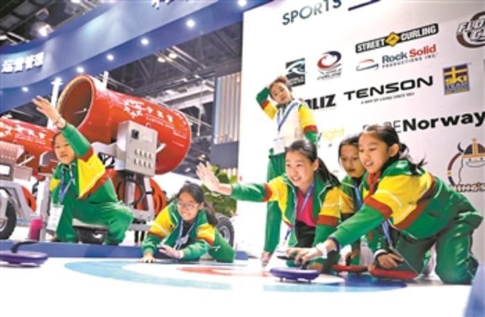 图为参观展览的小学生们在体验冰壶运动。