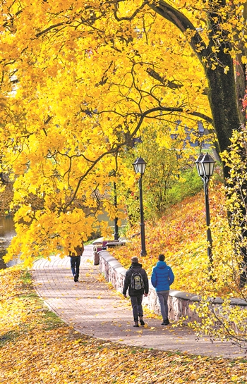 10月14日,在拉脱维亚首都里加,人们经过遍布落叶的街道。