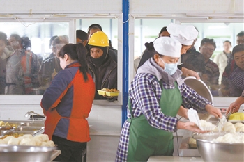 10月15日中午,奥运村建设工地上的工友们在食堂排队打饭,一份饭菜10元钱。
