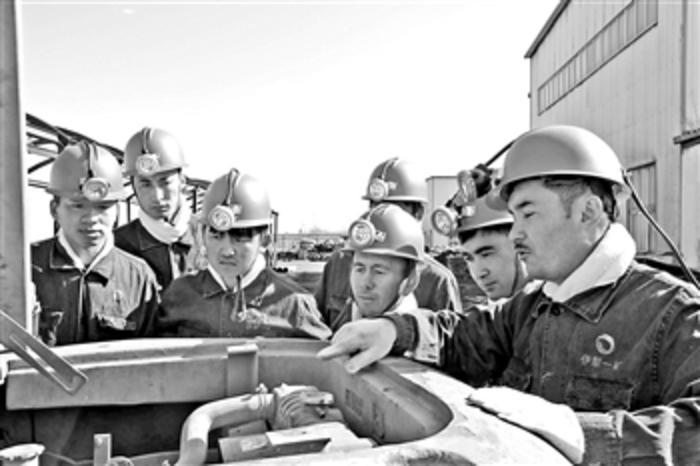 近日,山东能源新矿集团伊犁能源一矿运输班的职工在学习机车维修保养技术。