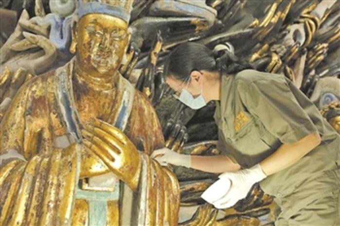 文物修复工作非常耗时,光是修复一尊石像指甲盖面积大小的彩绘就要花上一整天时间,这也意味着修复者需要在现场狭小的空间里保持一个姿势一整天。尽管如此,她容不得自己有一丝松懈,用8年时间独立完成了千手观音80只手、20件法器的修复。她用智慧、毅力和汗水让石刻重获新生,把最耀眼的光彩还给文物。