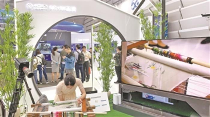 图为:中国移动展区,绣娘正在5G+8K高清直播镜头下进行苏绣制作。吴庭 摄