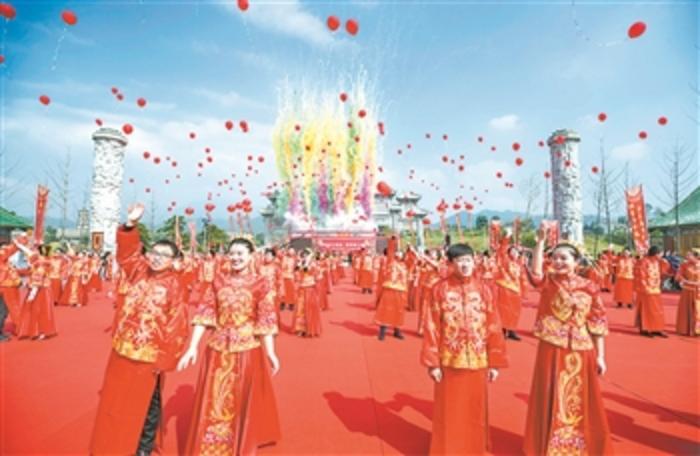 10月19日,富士康济源科技园第二届“情系王屋山 缘梦富士康”中式集体婚礼在王屋山景区举行,100对来自富士康生产线上的农民工新人喜结良缘。
