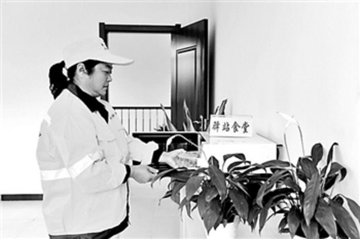 10月16日,环卫工人在“幸福驿站”内使用微波炉加热午餐。
