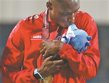 10月27日,巴林队球员卡迈勒在颁奖仪式上亲吻吉祥物。