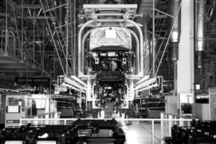 10月29日,在上汽大众生产车间内,工作人员在生产流水线上作业。