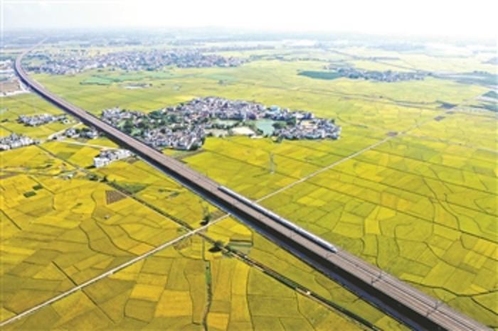 眼下,广西宾阳县古辣镇大面积稻田进入收获期,一列列南来北往的动车从稻田间飞驰而过,构成一幅幅美丽的丰收图画。