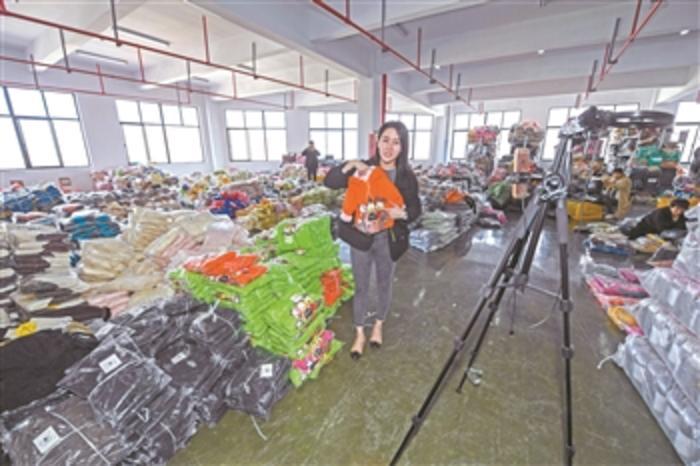 10月24日,织里镇永信电商产业园“众创空间”的一名网络主播在发货仓库内进行童装销售网络直播。织里镇本地的100多家童装企业在该电商产业园搭建的网络直播平台上销售各类童装,日均出单量达10万余件,年销售额超10亿元。
