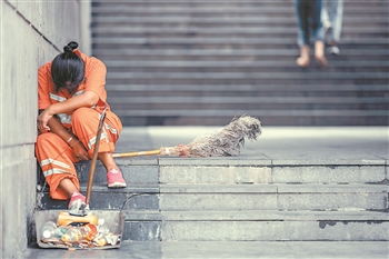 9月6日,在重庆朝天门广场,一名环卫工工余时间靠在楼梯边休息。张涛 摄/视觉中国