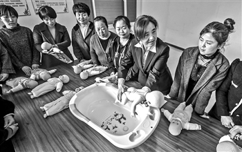 10月23日,家政老师在河北省武强县就业培训中心指导学员给“婴儿”洗澡。
