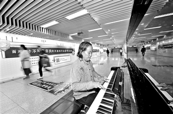 10月24日上午,64岁的地铁保洁员徐桂芳,坐在成都地铁过道的公共钢琴前,弹奏了一首《上学歌》。