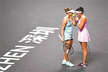 10月30日,2019深圳WTA年终总决赛第四个比赛日女子双打比赛中,梅尔滕斯(比利时)/萨巴伦卡(白俄罗斯)以2比0战胜中国台北组合詹皓晴/詹咏然。