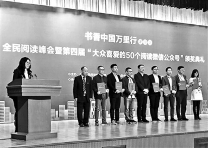 本报讯(记者 欧阳)10月25日,由中国全民阅读媒体联盟、中国新闻出版传媒集团、中共漯河市委和漯河市人民政府主办的全民阅读峰会暨第四届“大众喜爱的50个阅读微信公众号”颁奖典礼在河南漯河举行,阅读公社、书香江苏等公众号获奖。