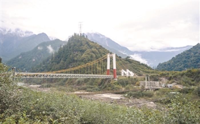 山峦叠翠的峡谷间,三座大桥如阶梯状,横架于汹涌奔腾的易贡藏布江通麦段上。第一座桥,悬索木吊桥,桥板脱落。第二座桥,双塔双跨悬索桥,锈迹斑斑。第三座桥,新建的256米单跨单塔悬索桥,巍峨壮观。
