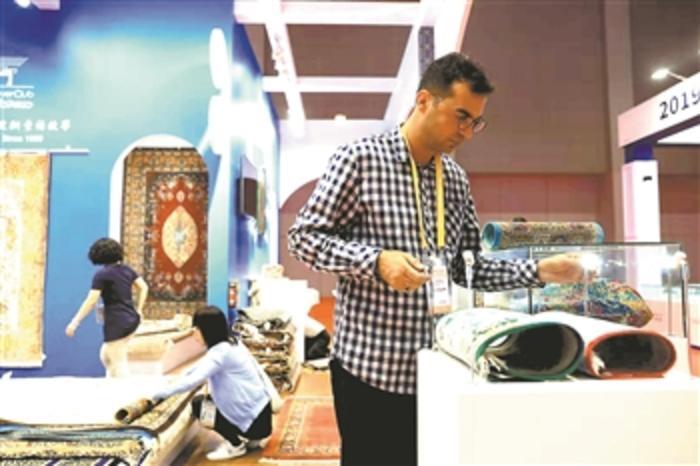 11月4日,第二届中国国际进口博览会开幕前夜,来自伊朗的地毯商在国家会展中心(上海)展馆内为第2天的展出精心准备。