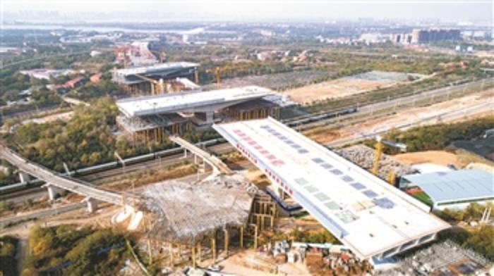 率先完成转体的2号墩转体桥位于武汉市黄陂区松树岗村,桥长142米、宽42.9米、高22米,完成转体后跨越京广货线下行、武汉北下行环发线两条铁路线。