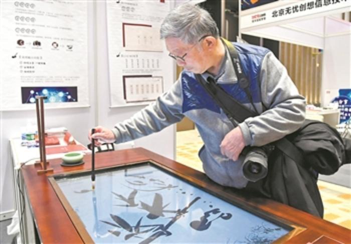 11月9日,一名观众通过涂画智能书法台进行书法创作。