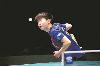 中图:11月10日,中国队选手孙颖莎在单打比赛中发球。最终她以3比2战胜日本队选手伊藤美诚。