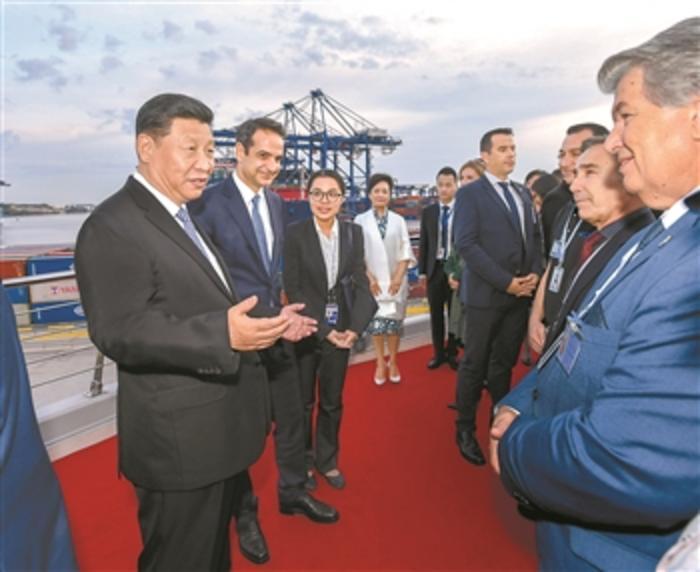 习近平说,很高兴来到比雷埃夫斯港参观。百闻不如一见。今天我在这里看到,中国倡议的“一带一路”不是口号和传说,而是成功的实践和精彩的现实。“一带一路”倡议坚持共商共建共享,不是一家说了算,而是大家共担责任,共享成果。中国在对外交往中秉持正确义利观。我很高兴得知,在你们困难的时候,中远海运比雷埃夫斯港项目帮了你们。你们把比雷埃夫斯港建设好,就是共建“一带一路”的重要参与者和贡献者。祝你们工作顺利、生活幸福。