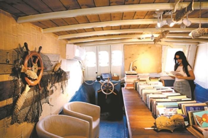 11月8日,参观者在“海上书房”里看书、学习。该图书馆位于海南三亚西岛上,是由三艘废弃渔船改造而成,分为书房、读者俱乐部、海上书房船宿3个部分。书房的建立,受到了这个海岛渔村近4000名居民的欢迎。张进刚 摄
