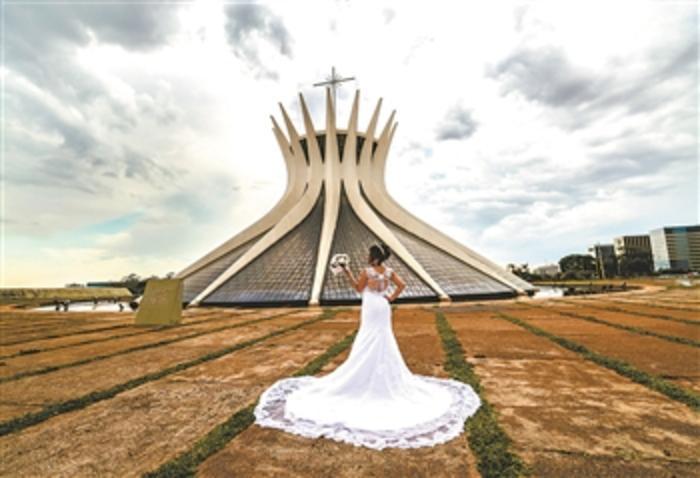 11月2日,一名新娘在巴西首都巴西利亚大教堂前拍摄婚纱照。