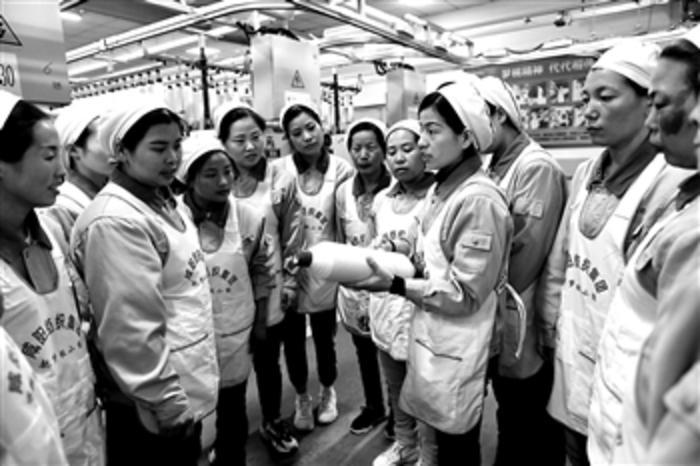 11月12日,在咸阳纺织集团公司一分厂细纱车间,赵梦桃小组第13任组长何菲与组员们切磋技艺。从被命名为“赵梦桃小组”至今,56年来,几代赵梦桃小组成员传承“高标准、严要求、行动快、工作实、抢困难、送方便”的梦桃精神,在工作中作表率、当先锋,生产指标月月领先,工作任务年年超额完成。 袁景智 摄
