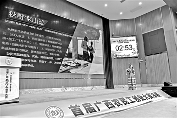 11月10日,首届广西农民工创业大赛决赛在南宁·中关村创新示范基地举行,经过激烈角逐,《互联网+扶贫红薯创新深加工》项目夺得大赛成长组一等奖,获得奖金10万元。决赛不仅展示了从全区遴选出的20个优秀农民工创业项目,也充分展现了广西农民工创业者的风采。图为参赛选手在展示自己的创业项目。本报记者 庞慧敏 通讯员 杨 樯 摄