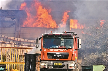 11月12日,在以色列斯代罗特,一座工厂遭火箭弹袭击后起火。 新华社/基尼图片社