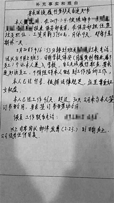 过去,钟玲曾在别的公司上班,她了解到对于怀孕职工,公司会相应减少工作量,且不安排夜班,她认为“物业公司做法明显不合法”。2月23日,钟玲向物业公司邮寄了《要求继续履行劳动关系通知书》,公司签收后没有回应。3月13日,钟玲向珠海市劳动人事争议仲裁员申请劳动仲裁。
