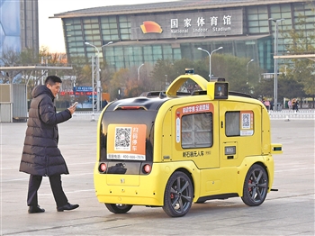 11月14日,一辆车身印有“扫码停车”字样的无人移动便利车在北京奥林匹克公园行驶,消费者选择商品后扫码支付即可取货。