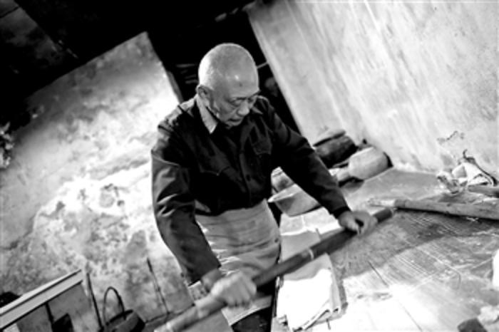 11月14日,俞先友在打面店用青竹竿打面。