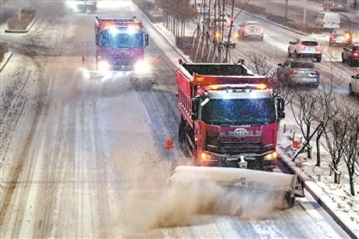 11月17日,在长春市南关区卫星路快速路上,清雪车辆在清理路面积雪。 新华社记者 张楠 摄