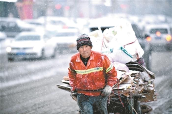11月17日,吉林省长春市遭遇强降雪天气,长春市城市管理局及时启动清雪预案。截至当日17时,全市共出动环卫工人1.4万余名,环卫清雪车辆1400余台,外雇社会化运雪车辆1600余台。下图为一名环卫工人正在雪中运送垃圾。新华社记者 颜麟蕴 摄