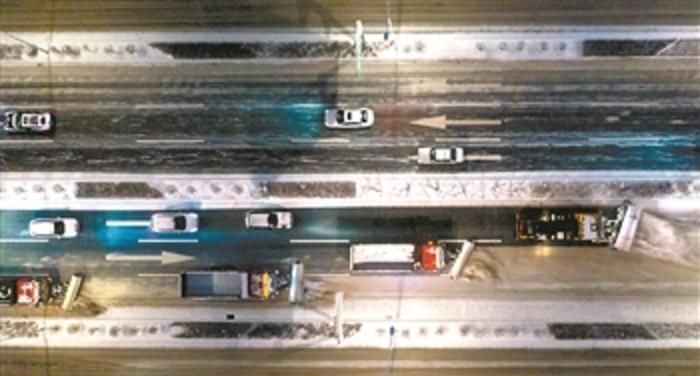 11月17日,在长春市南关区卫星路快速路上,清雪车辆列队清理路面积雪(无人机拍摄)。 新华社记者 张楠 摄