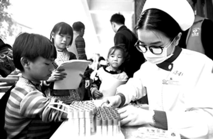 在桂黔乌英苗寨,柳州市妇幼保健院的医护人员为小朋友抽血体检。