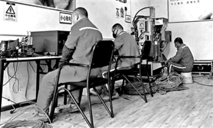 不大的修理间顿时忙碌热闹了起来,7个人分工明确,开电脑测试、启动注塑机预热、清理损坏线头、分类登记等等。排列设备的各种疑难杂症在他们娴熟的检修技术下被一一排除,一根根大线不断“重获生机”。