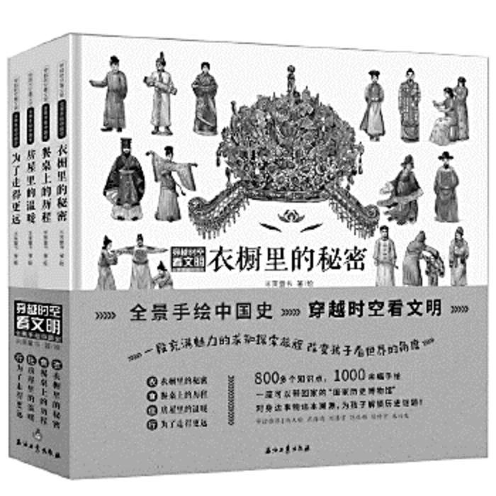 本书由《衣橱里的秘密》(中国古代服饰卷)、《餐桌上的历程》(中国古代餐饮卷) 、《房屋里的温暖》(中国古代建筑卷)、《为了走得更远》(中国古代交通卷)四册组成。800多知识点、1000余幅图画,上万文物蓝本,为孩子揭秘万物由来,还原历史样貌,让阅读体验像穿越历史时空一般新奇美妙。由“点”入手,延伸出更广的“面”,用故事、情景、图解、注释梳理看待历史的角度,给孩子一个清晰的中国正史概念。内容出自历史专著、考古报告、出土文物、传世美术作品、影像资料,以及专家学者的指导和审核,大到建筑、宫殿模型、街道场景,小到家居布置、交通工具、人物服饰等内容均有据可查。