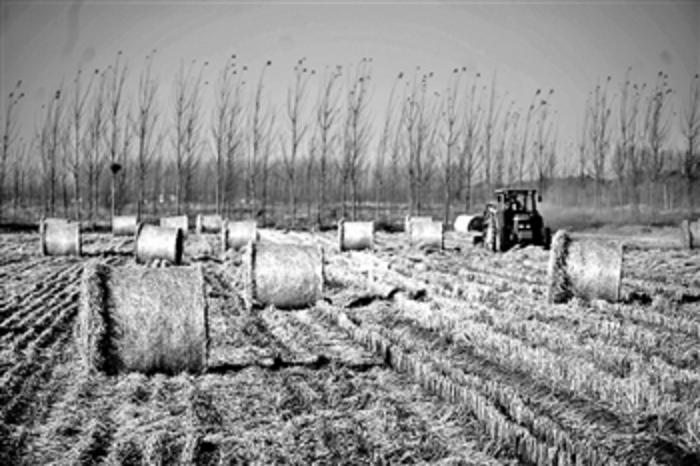 河北省唐山市曹妃甸区地处渤海湾畔。初冬时节,工人忙着收获稻草,用于加工动物饲料。