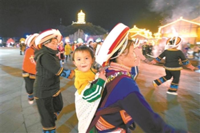 11月19日晚,一位彝族妇女背着小朋友跳火把舞。贵州省晴隆县阿妹戚托小镇是安置该县三宝彝族乡整体搬迁民众的新家园,搬迁后的居民为了充实晚间娱乐生活,齐聚在阿妹戚托小镇金门广场,载歌载舞,欢度搬迁新家后的幸福生活。