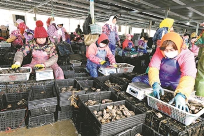 11月19日,在山东省荣成市寻山集团渔港码头,养殖工人正分拣吊装准备转场南下的鲍鱼,一派繁忙的景象。